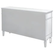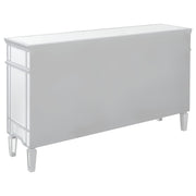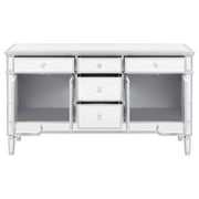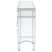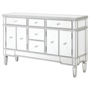 This mirrored accent cabinet has plenty of storage and panache. Fashioned from a combination of materials, it brings modern appeal and convenience to the home. It features birchwood and MDF construction in a silver finish to match the lustrous mirrored accents. Nine mirrored drawers with crystal hardware feature plenty of storage capabilities for all your needs. It's a fine addition to a modern styled living room or entertainment room. Key Features: • Mirrored accent cabinet with silver framing and beveled glass panels • Features four doors and five drawers for versatile storage options • Crystal hardware and reflective panels offer a glamorous finish • Sleek silhouette works well in living rooms or entertainment spaces • Crafted from engineered wood, mirror, and glass • Includes tip-over restraint and chrome-finished hardware