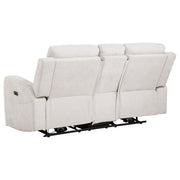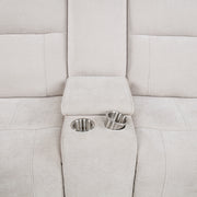Unwind in perfect sync with this chenille power reclining loveseat, crafted for shared comfort and convenience. Dual recliners offer smooth, quiet motion at your touch, while a center console adds thoughtful storage with a lift-top compartment and two removable stainless steel cup holders. Wrapped in soft, textured chenille and reinforced with a durable metal frame, this piece blends everyday luxury with functional ease. Key Features: • Power loveseat with smooth dual recliners offers effortless, personalized comfort • Ivory chenille upholstery adds softness and a subtle textured visual appeal • Center console features lift-top storage for remotes, books, or other items • Includes two removable stainless steel cup holders for clean and easy use • Durable metal framing supports long-term strength and daily reliability • Polyester chenille fabric balances plush comfort with easy-care maintenance