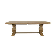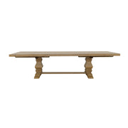 This rectangular extension dining table blends classic European elegance with artisan craftsmanship. Crafted from solid pine, it features a double pedestal trestle base that exudes romantic charm and timeless character. The sculpted pedestals, connected by a wide plank accent, create a striking focal point with an authentic handcrafted feel. A planked tabletop enhances its rustic appeal, while two 16-inch removable leaves extend the table up to 126 inches, making it perfect for gatherings large and small. Built for both beauty and durability, this table is an inviting centerpiece for any dining space. Key Features: • Rectangular dining table with a sculpted double pedestal trestle base • Crafted from 100% solid pine for strength and long-lasting durability • Two 16-inch removable leaves extend the table up to 126 inches • Wide plank accent between pedestals adds an artisan, handcrafted feel • Planked tabletop highlights natural wood grain with a rustic honey finish • Romantic farmhouse style complements traditional and casual interiors