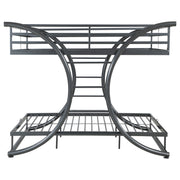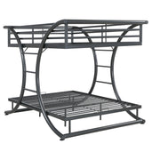 If traditional bunk beds tend to lend an air of fun to sleeping, then this Stephan full/full bunk bed imparts an amusement park type of air. Like most bunk beds, it comes with built in ladders for easy up-and-down access to the top. What sets this one apart is that the ladders on are on the sides instead of the ends and are curved! Although it conveys fun and youthfulness, the top bunk has side rail slats to ensure safety. Adding to the mystique is the dark gunmetal finish. Key Features: • Heavy duty metal bunk bed in sleek gunmetal finish • Dual curved design elements with built-in ladders on both sides • Available in twin-over-twin and full-over-full sizes • Full length guardrails on upper bunk • Constructed with steel • Slat kits included