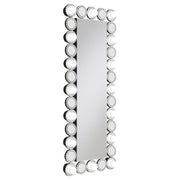 The contemporary full-length mirror lends a wonderful accent piece to your rooms. Featuring 16 LED lights that offer an even glow adding a glamour style to this piece. The Hollywood inspired frame is bordered by individual round mirror tiles, each further framed in sparkling mirror trim. Bold lines and sophisticated mirror plates merge to offer a modern touch. Situate this striking accent mirror within an entryway foyer to greet family and guests, or simply find your beautiful look through this mirror. Key Features: • Full-length wall mirror with integrated LED lighting for added function and visual impact • Sixteen evenly spaced LED bulbs create balanced illumination across the mirror surface • Framed with layered circular mirror tiles bordered by reflective acrylic trim • Hollywood-style frame delivers a dramatic and modern glamour aesthetic • Tall rectangular mirror offers full-body reflection for use in bedrooms or entryways • Crafted from acrylic, engineered wood, and mirror materials for lasting quality