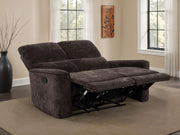 Softly tailored and built for comfort, this reclining loveseat invites everyday relaxation with ease. Deep cushions and plush chenille upholstery wrap you in warmth, while channel tufting along the back enhances support and flow. Smooth manual recliners extend at your fingertips, offering personalized comfort from seat to seat. Framed in durable wood and metal, it brings a perfect balance of softness, structure, and restorative ease to any living room. Key Features: • Reclining loveseat with manual recline and plush cushions for laid-back comfort • Dark brown chenille upholstery offers a cozy texture with soft, inviting warmth • Channel-tufted backrests deliver contouring support and casual structure • Wide padded arms provide comfort and relaxation in any position • Crafted from fabric, metal, plywood, and foam for dependable use • Ideal for casual living rooms seeking softness, ease, and functional style