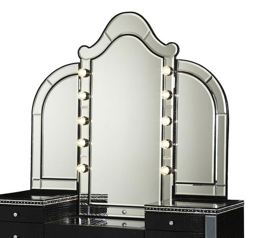 Hollywood Swank Collection by Aico Furniture Black Iguana finish Touch light Hollywood-style vanity mirror Chrome accents Solid hardwood construc...