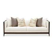 AICO Furniture Belmont Place Sofa in Espresso 9085815-CREAM-409. The Belmont Place Sofa brings refined comfort into your home with a clean-lined design and stain-resistant fabric that radiates sophistication. Six sumptuous accent pillows, including two with a striking marbled pattern, create a luxurious visual and tactile experience. The deep espresso frame accentuates the soft cream upholstery, creating a piece that's as timeless as it is inviting.