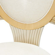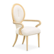 AICO Furniture Camellia Field Arm Chair (Set of 2) in Caramel 9090004-134. With its graceful silhouette and thoughtfully crafted details, the Camellia Field Dining Arm Chair is a statement of refined comfort. The oval back, adorned with camellia marquetry, pairs beautifully with the warm pecan finish and antique gold accents. Upholstered in soft chenille, it combines luxurious materials with a supportive design, offering an inviting and sophisticated dining experience.