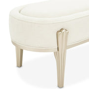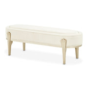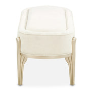 AICO Furniture Camellia Field Bench in Caramel 9090904-134. The Camellia Field Bed Bench combines practicality with refined design, offering a functional accent for the foot of your bed or any space in need of additional seating. Upholstered in soft chenille with subtle channeling details, the bench exudes texture and craftsmanship. Its champagne gold-finished legs, featuring sculptural details, add warmth and charm to your bedroom or living area.