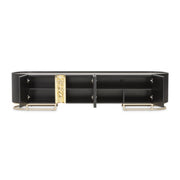 AICO Furniture Lisbon Media Cabinet in Silken Matte Black LFR-LSBN081-826. Introduce an air of sophistication to your entertainment space with our Lisbon Media Cabinet. Designed with a channeled front and finished in a silky matte black, this exquisite piece exudes elegance and style. The gold accent adds a touch of opulence, perfectly complemented by the gold legs and captivating mirrored top inlay. With four doors offering ample internal storage, this luxurious media cabinet seamlessly combines functionality, design, and refinement.