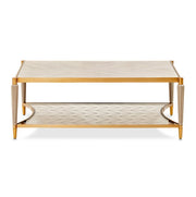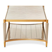 AICO Furniture St.Charles Rectangular Cocktail Table in Dove Gray 9088201-803. The Saint Charles Cocktail Table is a centerpiece that commands attention, distinguished by its intricate etching on the tinted glass shelf beneath. This feature not only adds visual interest but also a layer of sophistication to the piece. The Dove Gray finish on the wooden top is complemented by the bronze frame, making this table a blend of traditional craftsmanship and modern design.
