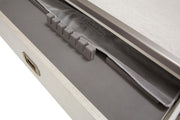 - Features metal campaign hardware and decorative nailheads in a bronze finish