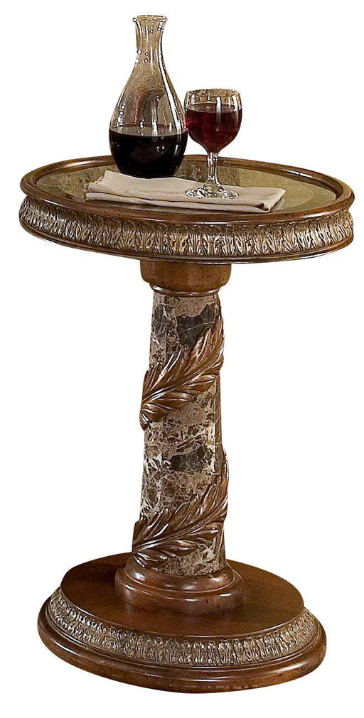 Villa Valencia Collection by Aico Furniture Classic Chestnut Finish Crafted from Birch solids Carved wooden leaves Twisted and shaped marble pi...