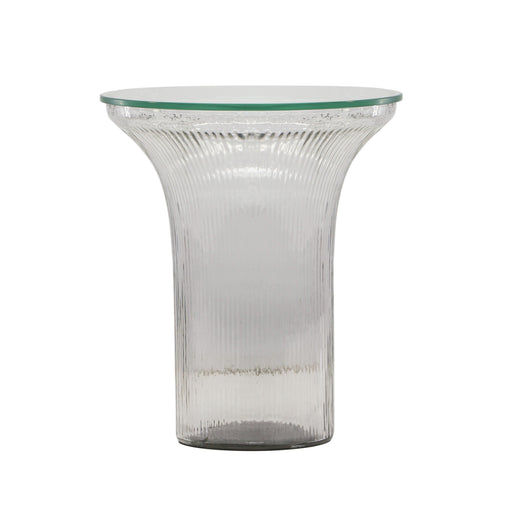 Introducing the Cassandra Glass Flared Side Table, a captivating blend of nostalgia and modern design, available in midnight blue or transparent cl...