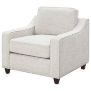 Add understated elegance to your seating area with this upholstered accent chair. Wrapped in soft beige chenille, it brings a light, airy feel that complements any décor. The sloped track arms and dark brown tapered wooden legs create a refined silhouette that balances comfort and sophistication. A boxed seat and back cushion with welt trim highlight its tailored design. Built with a sturdy wooden frame and plush foam cushioning, this chair offers timeless appeal and versatile style for modern or transitional interiors._x005F_x000D_ Key Features: • Accent chair with refined transitional design and soft silhouette • Beige chenille upholstery adds a light, versatile appearance • Sloped track arms create smooth modern lines and easy comfort • Boxed seat and back cushions feature classic welt detailing • Dark brown tapered legs add contrast and elegant support • Durable wooden frame ensures long-lasting everyday comfort