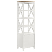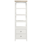 Spacious or compact, a casual living space has storage needs, and this wood media tower is a solid choice. Organize books and implements neatly while adding a fresh, inspiring look to a living room or family room. This modern tower is a mix of cottage-style, coastal, and rustic farmhouse, offering a superbly versatile fit. White finish wood construction features a four-shelf open bookcase above a two-drawer storage unit with full-drawer extension glides, as an eye-catching geometric look places X-shape elements on each side of its open bookcase. A brown finished ash veneer top changes up the style to add even more design flexibility. Key Features: • Organize books and implements neatly with a wood media tower • White finished wood construction with four-shelf open bookcase • Two-drawer storage unit with full-drawer extension glides • Eye-catching geometric look with X-shape elements on each side • Brown finished ash veneer top for added design flexibility