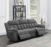 Design a living room built for comfort and relaxation around this transitional reclining sofa. Offering dual recliners operated with a side pull lever, the sofa encourages rest and rejuvenation in inviting style. Charcoal upholstery delivers a smooth, soft look and feel, while plush cushions are both supportive and comfortable for lounging. Pillowtop armrests are ideal for curling up on a cool evening or indulging in a quick afternoon nap. Tufting accents add support and structure to plush cushions while creating a dimensional look that works in your living room. Key Features: • Dual recliners operated with side pull lever for rest and relaxation • Charcoal upholstery for a smooth, soft look and feel • Plush cushions for supportive and comfortable lounging • Pillowtop armrests for curling up on a cool evening • Tufting accents for support and structure with a dimensional look