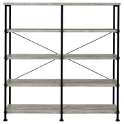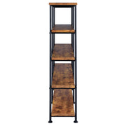 Embrace a traditional look with contemporary upgrades. Choose this bookcase to organize accents and books in a transitional space. Minimalist styling reflects a classic dynamic reflecting a hint of industrial aesthetics. Find plenty of room on four side shelves to display books and decor. Select from finishes that suit your space. Key Features: • Double bookcase with four extra-wide tiers for ample display and storage space • Rustic nutmeg finish offers a warm wood tone with industrial character • Black powder-coated steel frame enhances contrast and structural stability • Crossbar detailing on the back reinforces support without adding bulk • Open shelf design keeps contents visible and accessible from all sides • Made from engineered wood, melamine paper, and heavy gauge metal