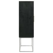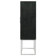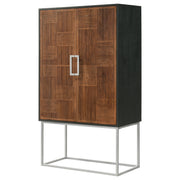Get the party started with a sophisticated, contemporary bar cabinet. Closed, it's simply a stylish cabinet, complete with decorative checkerboard door fronts and geometric handles that catch the eye in a living or dining room. When opened, the cabinet reveal plenty of space for all your wine and cocktail needs, complete with two interior shelves to keep everything at your fingertips. The cabinet is crafted from mango wood, with a warm walnut finish on its doors and a black case finish. The cabinet is elevated on an iron base that receives a classic silver finish, delivering height and lightness to the overall look of the piece. Key Features: • Get the party started with a sophisticated, contemporary bar cabinet • Closed, it's simply a stylish cabinet, complete with decorative checkerboard door fronts and geometric handles • When opened, the cabinet reveals plenty of space for all your wine and cocktail needs, complete with two interior shelves • Crafted from mango wood, with a warm walnut finish on its doors and a black case finish • Elevated on an iron base that receives a classic silver finish, delivering height and lightness to the overall look of the piece