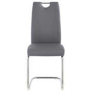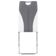 Sleek and stylish, this side chair features a modern cantilever design with a two-tone faux leather finish. Upholstered in soft grey with crisp white accents, the chair showcases a sculpted silhouette highlighted by tailored welt trim. A polished chrome base adds contemporary shine and retro flair, while the integrated handle offers easy movement. Perfect for elevating any modern dining space. Key Features: • Ultra-modern side chair with cantilever base and integrated handle design • Grey leatherette seat is accented with crisp white leatherette panels • Polished electroplated chrome frame offers retro style and lasting support • Welt trim details enhance the contoured backrest and tailored silhouette • Built with engineered wood, high-density foam, and heavy-gauge metal • Great for modern dining rooms, breakfast nooks, or high-style conference spaces