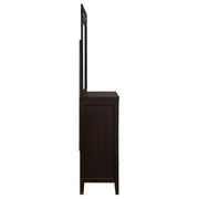 Classic sophistication meets everyday function in this dresser and mirror set. The six-drawer dresser showcases a rich cappuccino finish with brushed silver hardware and wide, smooth-gliding drawers for ample storage. Above, a matching rectangular mirror adds light and space with its leatherette-padded frame detail. Together, they create a cohesive centerpiece for your bedroom, blending traditional elegance with modern comfort and built from durable rubberwood and veneer construction. Key Features: • Six-drawer dresser paired with a matching padded frame mirror • Cappuccino finish enhances warmth and transitional character • Brushed silver hardware provides contrast and modern appeal • Spacious drawers offer organized storage for bedroom essentials • Mirror adds brightness and depth with its generous size • Crafted from rubberwood, veneer, and engineered wood for strength
