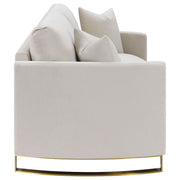 Indulge in opulent comfort with this textured velvet loveseat. Its reversible feather blend seat and back cushions, complemented by curved arms and gold stainless steel legs. Smooth upholstery and lustrous details blend simplicity with timeless splendor, making this piece a perfect focal point for refined interiors. With its inviting profile and graceful presence, it elevates both style and relaxation. Key Features: • Loveseat with plush seating designed to elevate both comfort and style • Textured velvet finish in a warm camel hue • Reversible feather blend cushions ensure adaptable support • Curved arms and gold-accented stainless steel legs add subtle luxury • Fully encased engineered wood frame with sinuous springs and pocket coils • Reversible seat and reversible back cushions for easy maintenance
