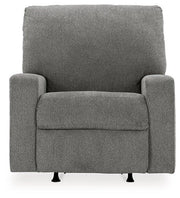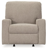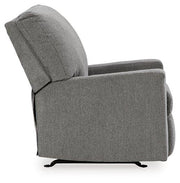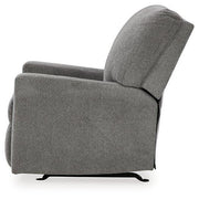 You’re in for a neat treat with this rocker recliner. Its comfy seat is covered in soft, textural upholstery, and the wide track arms are eager to support your quest for total relaxation. A side button reclines the seating to a relaxing position. Or simply rock and melt the cares of the day away.