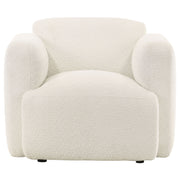 This modern accent chair brings sculptural softness and deep comfort to any living space. Wrapped in a richly textured fabric, its rounded frame flows from low-profile back to wide track arms with effortless ease. Plush foam cushioning and pocket coil seating deliver the ideal blend of sink-in softness and lasting support. With its minimal silhouette and gentle curves, this chair adds a cozy yet elevated presence to any room. Key Features: • Accent chair with sculpted form and rounded silhouette for modern minimalist appeal • Textured white fabric upholstery adds warmth and visual depth to any room • Curved track arms and low-profile frame create a cocoon-like seating experience • High-quality foam cushioning ensures soft comfort and inviting relaxation • Pocket coil seating provides lasting support and maintains its shape • Ideal as a standalone lounge chair or cozy addition to a modern seating arrangement