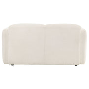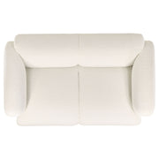 This sculpted loveseat brings bold softness and inviting texture to modern spaces. Its low-profile frame is wrapped in richly textured fabric with a cozy, tactile feel. Rounded track arms and a smooth, contoured silhouette create a cocoon of comfort. High-quality foam and pocket coil seating ensure long-lasting support without sacrificing softness. With a clean, minimal form, this two-seat loveseat adds warmth and refined presence to any living room or lounge. Key Features: • Two-seat loveseat with low-profile, sculptural silhouette and soft, rounded edges • Textured white fabric upholstery offers warm tone and inviting hand feel • Curved track arms and contoured frame provide supportive modern style • High-quality foam padding adds plush comfort to every seating zone • Pocket coil seating delivers durable support and shape retention • Perfect for compact living spaces seeking soft form and relaxed design