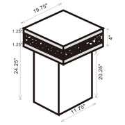 Showcase sculptures and decor on this stunning, modern glam accent table. A square table sits on a tall square pedestal for an edgy, bold expression. Smooth mirror trim and surfaces cover every edge, creating a sleek flair. Glittering acrylic crystals line the interior of a clear center band for an elevated luxurious touch. Small disguised feet offer a subtle elevation over rugs and floors and offer extra stability. Key Features: • Square shape offers bold, edgy flair and eye-catching look • Mirror tile trim encompasses the surface for a highly reflective frame • Acrylic crystal accents tucked within clear center offer a breathtaking glamorous expression • Tall column pedestal base levitates the table surface for a sleek silhouette • Small feet beneath offer subtle lift to keep table stable on rugs and flooring