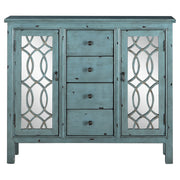 This well-crafted wooden cabinet adds a splash of color and classic charm to any space. Finished in a distressed blue, it features four center drawers for organizing linens or silverware, while two side doors with mirrored insets and carved lattice detailing offer additional storage. The carved curves and vintage styling blend traditional design with contemporary flair, making it a standout accent in dining rooms, entryways, or living spaces. Key Features: • Wooden cabinet with a distressed blue finish for a vintage, timeworn character • Includes four center drawers for enclosed, organized household storage • Mirrored door insets feature a decorative wood lattice pattern for added charm • Two side cabinets include interior shelves for versatile storage options • Sturdy wooden construction with detailed molding and clean edge lines • Ideal as an accent cabinet in living rooms, entryways, or dining areas