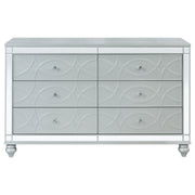 Give your home a modern glam update to classic design with this transitional six-drawer dresser. It features a glitzy design that takes center stage in any modern bedroom. It's fashioned with a vibrant silver metallic finish with fret work detail on the front panels and drawer fronts. The drawers are adorned with crystal-like pulls and the top ones are lined with black felt. Delicate bun feet complete the design of this exquisite showpiece dresser. Key Features: • Six-drawer dresser with silver metallic frame and mirrored trim • Fretwork panel overlays and crystal drawer pulls enhance glam styling • Top drawers are felt-lined to store watches, jewelry, or eyewear • Smooth-gliding drawers with clear sealer interior finish for convenience • Turned bun feet elevate the profile with traditional design elements • Engineered wood build with mirrored and polyresin detailing