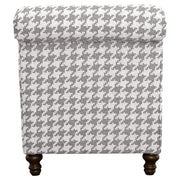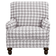 A standout houndstooth check pattern draws due attention to this fashionable accent chair. With tailored English arms and turned legs offering a contrasting espresso finish, this chair impresses with a blue and light grey upholstered cover. A solid wood frame with a sinuous spring deck sets the stage for durability. Attached seat and back cushions remain stationary to prevent shifting. Offer upbeat personality and a whimsical touch to a modern space with soft elements in this enticing chair. Key Features: • Bring LOVE to your living area with this sophisticated farmhouse collection • Tailored English arms • Turned legs in espresso • No rearranging required with easy to maintain attached back cushions • Extend the life of you upholstery set with attached seat cushions • Complete your look with a blue hounds tooth patterned accent chair