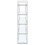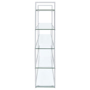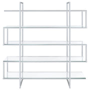 Jump on a trendy, modern bandwagon. Refresh a contemporary space with a stylish piece designed to organize and display. This four-tier bookcase offers a cool profile with personality. Tempered glass shelves blend perfectly with a steel frame. Make room for books, photos, and decor on this edgy, attitude-rich piece. Key Features: • Modern chrome and glass bookshelf with five clear tempered glass shelves • Polished chrome frame adds a sleek metallic accent to any space • Open tiered layout allows full access from all sides • Tempered glass shelves provide durable and transparent storage • Perfect for open floor plans, contemporary living areas, or offices • Includes tip-over restraint to anchor securely against walls