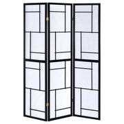 Introduce modern elegance into your space with this three-panel folding shoji screen. Designed with a black wood frame and contrasting white panels, it showcases a striking geometric linear pattern that draws the eye. The adjustable hinges allow flexible positioning, making it perfect for dividing a room, creating privacy, or serving as a decorative accent. Crafted with FSC-certified rubberwood and durable fabric panels, this room divider blends traditional Japanese style with contemporary appeal for versatile use._x005F_x000D_ Key Features: • Three-panel room divider with Japanese-inspired geometric linear design • Black wood frame contrasts elegantly with white fabric panel inserts • Adjustable folding hinges allow versatile positioning and room separation • Durable fabric panels crafted from polyester and rayon blend for strength • Constructed with FSC-certified rubberwood for eco-friendly craftsmanship • Functions as both a privacy screen and decorative contemporary accent