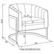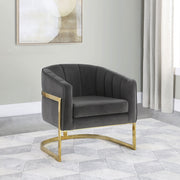 Exquisitely modern and stylish, this bucket chair provides comfort and aesthetic allure. It's upholstered with soft velvet that will have you sinking into the padded cushioning. Vertical tufting adorns the backrest for an eye-catching appearance. The bold gold frame will never go unnoticed, perfectly supporting this piece as you relax. Use this dark grey accent chair in your living room, bedroom, or home office. Key Features: • This modern barrel chair with its floating metal base will be the perfect room accessory • Vertical tufted channels frame inside back and attached seat • Soft velvet upholstery in a dark charcoal grey • Metal base in a brushed gold finish