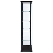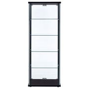 Transparency and linear styling make this curio cabinet stand out and shine. Simple design work blends straight lines with a slender black frame and tempered glass shelves. Push-to-open doors offer easy access to interior shelving. Put your best decor on display in this elegant piece that works beautifully in a living room or end wall. This enticing curio cabinet delivers a breathtaking look in modern and more traditional interiors. Key Features: • Black-finished frame with clear tempered glass for a sleek, modern style • Five tiers of open glass shelving for collectible or décor display • Push-to-open glass doors allow smooth and handle-free access • Sturdy construction with glass, engineered wood, and laminate accents • Ideal for use in living rooms, offices, or dining spaces • Includes chrome hardware accents and tip-over restraint