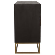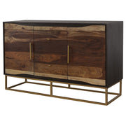 A handcrafted accent cabinet from India makes its presence known. With its mix of natural wood colors, it'll instantly captures attention in your living area. Gold hardware with a matching geometric base provides durability and aesthetic flair. Two large cabinet doors hold your valuables within. Neatly arrange your items on the single interior shelf. Key Features: • Handcrafted from sheesham and acacia wood with artistic wood grain • Gold metal base and handles add sleek contrast to natural tones • Two cabinet doors open to a single interior shelf for storage • Painted doors enhance the cabinet’s unique appearance • Ideal for entryways, living rooms, or dining areas • Made in India and constructed from solid wood, engineered wood, and metal