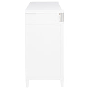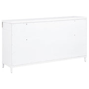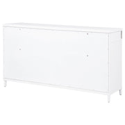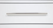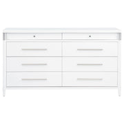 This eight-drawer dresser exudes modern sophistication through a sleek silhouette and softened edges. Elongated brushed nickel pulls and vertical tube accents create visual interest while enhancing the dresser’s clean structure. Built from solid rubberwood, engineered wood, and finished with a smooth laminate veneer, it offers ample storage and felt-lined top drawers. Designed for refined function in any contemporary bedroom. Key Features: • Eight-drawer dresser with softened corners and a clean-lined, modern silhouette • White finish contrasts with brushed nickel pulls and vertical metal tube accents • Felt-lined top drawers with tinted interiors provide secure, organized storage • Drawers feature dovetail joints and glide smoothly on heavy-duty metal glides • Made from solid rubberwood, engineered wood, and smooth laminate veneer • Fully assembled dresser includes integrated tip-over restraint for added safety