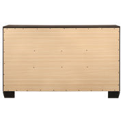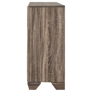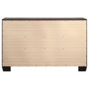Stylish and light, the soft hues from this six-drawer dresser highlight clean lines. Featuring a stunning exposed wood grain, the washed taupe finish radiates sophistication. Mid-century modern-inspired, delicately tapered legs combine with metallic drawer pulls to create a refined sense of style. Smooth and sleek drawer fronts and sides marry to put the focus on the variations in the natural oak. Black recessed grooves around picture framed case drawer fronts adds contrast. Key Features: • Six-drawer dresser with angular casing and tapered block-style feet • Washed taupe finish showcases weathered oak grain with a light neutral tone • Black recessed grooves outline drawer fronts for a crisp contrasting detail • Chrome bar pulls add a contemporary metallic touch to the rustic frame • Spacious drawer layout provides practical bedroom organization • Built from engineered wood and wrapped in a scratch-resistant veneer finish