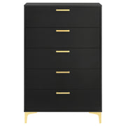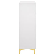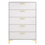 Open up your tight bedroom floor plan with this stately modern glam chest. Five spacious drawers stacked on top of one another keep garments and bedroom essentials stowed away and organized, helping you find what you need fast. A bright, white finish offers a sleek elegance, set off by warm golden accents. Along each of the five drawers is a slender gold finished pull, matched by the golden bracket legs that lift it up. Place this stunning five-drawer chest in your bedroom for an elegantly understated contemporary aesthetic. Key Features: • Perfect for contemporary and modern bedrooms • Five deep drawers offer all the space you need for garments and accessories • The bright, white finished frame ensures a light and airy disposition • Gold finished pull handles create a luxe flair • Gold bracket style legs carry through the warm metallic accents