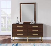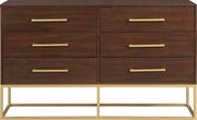 Outfit your space with this Maxine dresser, part of the Maxine collection of contemporary bedroom furniture. This lovely chest features a dark cherry finish over birch veneer construction for durability, strength, and resilience, and it���s equipped with brushed gold metal legs and hardware for a simplistic yet elegant finish. Pair this item with other bedroom essentials in the same collection for a beautiful look in your room.