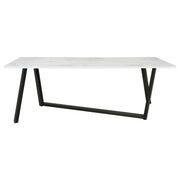 Strikingly modern with a classic twist, this dining table features a spacious faux marble top and an asymmetrical gunmetal metal base. The clean white surface offers the elegant look of marble with easy-care convenience, while the bold leg design brings architectural flair. Built for up to six guests, this table makes a dramatic statement in contemporary dining rooms or open-concept layouts. Key Features: • Contemporary rectangular dining table with sculptural metal base design • White faux marble tabletop offers a sleek, high-end look with easy maintenance • Gunmetal-finished metal legs provide stability and a bold, industrial accent • Asymmetrical leg placement adds a modern architectural element • Made with engineered wood and scratch-resistant, eco-friendly laminate veneer • Comfortably seats up to six guests, ideal for family meals or stylish entertaining