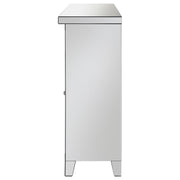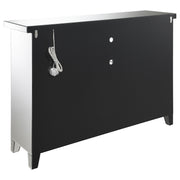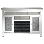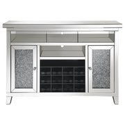 Create a breathtaking focal wall for your dining space with this stunning modern glam wine cabinet. Spacious and sparkling, this wonderful wine cabinet boasts glamorous elements like mirror tile and trim and a faux diamond inlay for a luxurious look and feel. Two side cabinets, adorned with crystal knobs, open to reveal interior storage, along with a 12-bottle compartment area below for all your storage solutions. A convenient foot switch illuminates the built-in puck lighting, showcasing decor along the open shelf. Present this glamorous wine cabinet in your entertainment area for a sophisticated and sleek modern expression to the space. Key Features: • Spacious rectangular frame creates a striking statement piece for a focal wall • Mirror tile and trim create a highly reflective surface • Faux diamond encrusted cabinet doors and crystal knobs offer a hint of sparkle • Two puck style lights cast glow across open top shelf for a soothing ambiance • 12-bottle rack keeps bottles neatly organized