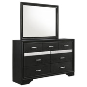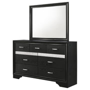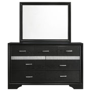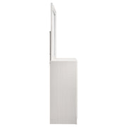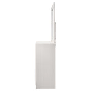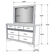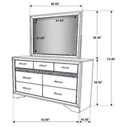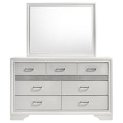 Bring sophisticated grace to your bedroom with this chic dresser, designed to lend an elegant touch to your personal sanctuary. Its felt-lined drawers offer safekeeping for delicate belongings, while the hidden jewelry drawer provides a discreet space for your treasures. The glittery panel across the front sparkles with opulence, enhancing the dresser's allure. Complementing the piece is the cheerful mirror, whose linear design and framed construction add a stylish ambiance. Choose from various finishes to perfectly round out your bedroom's design scheme. Key Features: ⢠Seven-drawer dresser with smooth full-extension glides ⢠Hidden jewelry drawer set behind glitter accent panel ⢠Top drawers are felt-lined for delicate storage ⢠Crystal drawer pulls add sparkle and contrast ⢠Framed mirror with beveled edges complements the dresser ⢠Constructed from engineered wood with white finish