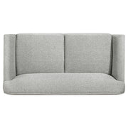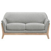With its sleek contours and vintage-inspired presence, this loveseat blends sculptural form with plush comfort. Flared arms and a smoothly arched backrest create an inviting silhouette, while the blonde wood base frames it in minimalist warmth. Upholstered in soft polyester fabric and built with a solid rubberwood foundation, this tailored piece elevates lounge areas, reading corners, or smaller living spaces with timeless appeal. Key Features: • Loveseat with sculpted profile and curved backrest for soft vintage flair • Blonde wood finish adds warmth to the minimal exposed wood frame • Flared armrests taper cleanly into the contoured upholstered back • Two-seat cushion design offers tailored seating with plush foam comfort • Covered in soft grey polyester fabric for inviting everyday lounging • Solid rubberwood construction ensures long-lasting support and strength