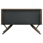 Elevate your dining area with this mid-century modern server. Beautifully designed with campaign style influences, this contemporary server rests on striking flared legs that offer a retro-inspired aesthetic. Tambour doors with finger-tip pulls bring out a nautical expression and a vintage touch. Open the cabinet doors and you will find ample space for all your dishes, stemware, and more. A rich, dark walnut finish brings out charming details. Key Features: • Casual dining can look elegant and still be functional for busy homes • Server with tambour doors offers plenty of storage • Fingertip pulls on each door lend a nautical aesthetic • Flared tapered legs bring a bold, mid-century modern vibe • Two removable shelves invite you to store and organize as you wish