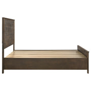 Bring warmth and function into the bedroom with this transitional storage panel bed. Crafted with a tall paneled headboard, it showcases clean lines highlighted by a rustic golden brown matte finish with wire-brushed details. The footboard features two spacious drawers with wooden pull handles, perfect for storing blankets or linens. Solid block-style legs provide sturdy support, while the blend of hardwood and veneer construction ensures lasting durability. This bed combines timeless style with modern storage convenience._x005F_x000D_ Key Features: • Rustic golden brown queen storage bed with transitional panel design • Tall paneled headboard creates a striking centerpiece for the bedroom • Matte finish with wire-brushed wood grain adds texture and rustic charm • Two storage drawers built into the footboard keep essentials neatly tucked • Wooden pull handles provide durability and a natural handcrafted appeal • Constructed with hardwood, veneer, and engineered wood for lasting strength