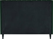 Snuggle up to a pet or other loved one in this richly upholstered Eva green velvet full size bed for the ultimate in rest and relaxation. The wing back headboard has cushioned vertical deep channel tufting, and both the side rails and footboard are upholstered too for your comfort. Tapered black wood legs match the upholstery and support this contemporary bed, elevating it sufficiently that you can store items underneath.
