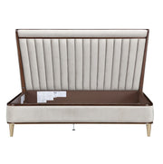 AICO Furniture Houston King Channel Tufted Bed in Walnut 9095000EK3-416. Blending contemporary sophistication with a relaxed aesthetic, the Houston Bed embodies understated luxury. Draped in plush mushroom gray velvet, the headboard's angular silhouette and deep vertical channel tufting create a striking yet inviting presence. A warm walnut-finished frame grounds the design, while gold accents along the base and tapered feet provide a refined contrast. Thoughtfully integrated USB ports ensure modern convenience without compromising elegance.