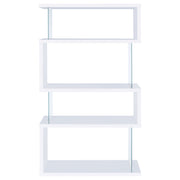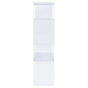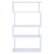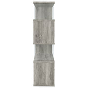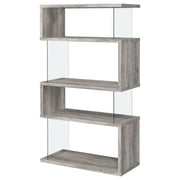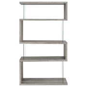 The asymmetrical zig-zag design of this contemporary bookcase creates a focal point in any room. Five open shelves in a light grey driftwood finish stack elegantly, supported by clear glass side panels that lend a modern flair to this furniture piece. Perfect for home offices, living rooms and much more, showcase anything from a book collection, decor, and other favorite items for all to see. With a flush base, this open bookcase unit rests sturdily and securely on the floor. Clean lines and a wonderful jagged design offer up style, functionality, and a stunning display. Key Features: • Zigzag bookcase design with alternating grey driftwood shelves • Clear glass side panels lend support and create a floating effect • Four open shelves offer space for books, décor, or personal items • Flush base rests flat on floors for added security and balance • Constructed from engineered wood, laminate veneer, and tempered glass • Modern sculptural format complements minimalist and contemporary rooms