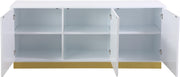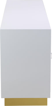 Give your dining room space a bold new look with this Cosmopolitan sideboard buffet. An amazing amount of storage space for china, dishes, serving pieces, and other essentials is only half the story with the Cosmopolitan. This white lacquer-finished sideboard features acrylic and gold hardware and a gold stainless steel base for a look that���s oozing contemporary panache from every angle. Use the top for a makeshift dessert bar after dinner.