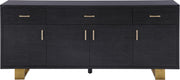 Organize flatware and silverware in the three spacious drawers of this Excel sideboard buffet. This beefy sideboard offers room aplenty for holding things you need in the dining room���out of sight and out of mind. The rich grey oak veneer lacquer finish with gold base and handles gives this unit the modern panache needed to mesh with nearly any contemporary dining set. Wood and stainless steel construction ensures lasting beauty and long-lived performance.